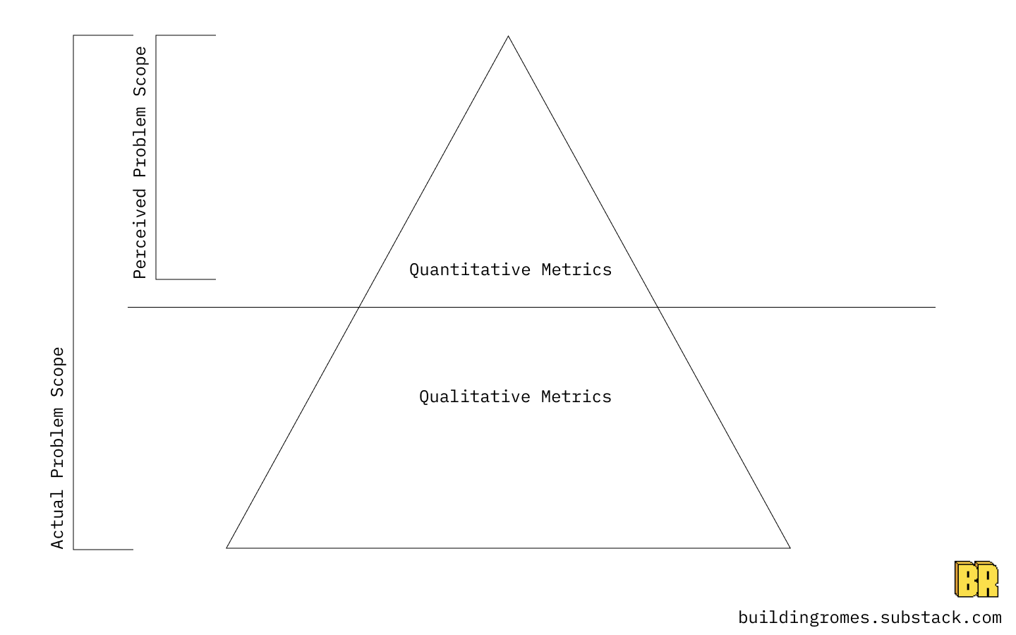 When solving problems we want quantitative data so we can measure, analyze, investigate, and make conclusions. Qualitative data requires a nuanced and thoughtful approach because this kind of measure is shaped by our own experiences and opinions thus a much harder task than tape measuring. However, often times the delta between perceived and actual problem scope lies not in numbers but in the qualitative aspects, the human bit.